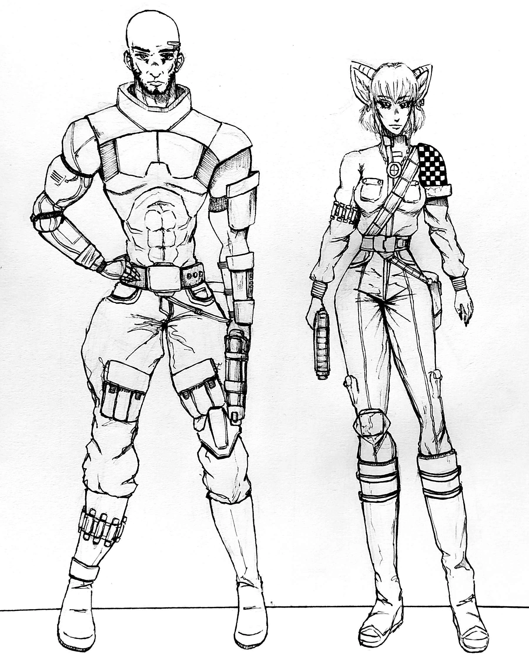 Najemnicy zgodzili się. Jedynie L4-K3 został na chwilę sam, by pomóc Estebanowi i Pantassie jak tylko mógł. Marr, Palmeri i Jolene poszli zaś w kierunku namiotu, który był największy i najbardziej oddalony od wszystkich. Był on wykonany z oliwkowej tkaniny, a w jego środku tliło się wątłe niebieskie światło emitowane przez niewielkie przenośne komputery o nieznanym przeznaczeniu. Przy jednym z nich siedziała kobieta w pudermantlu, używając klawiatury wprowadzającej do wykonania niezbędnych kalkulacji. Obok niej stał zaś osobnik płci męskiej z długimi, zielonymi włosami i błękitnymi oczyma odziany w lekką, rozpiętą kurtkę, która niezapięta odsłaniała szarozielone ubranie o bardzo wysokim kołnierzu, acz takim, który nie przylegał mu bezpośrednio do szyi. Jego twarz była raczej cienka; miał niewielkie oczy i usta, cieniutkie brwi i małe nozdrza, a także bródkę z dołeczkiem.